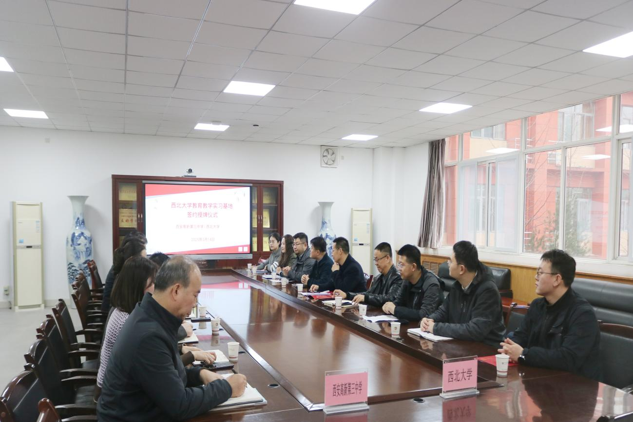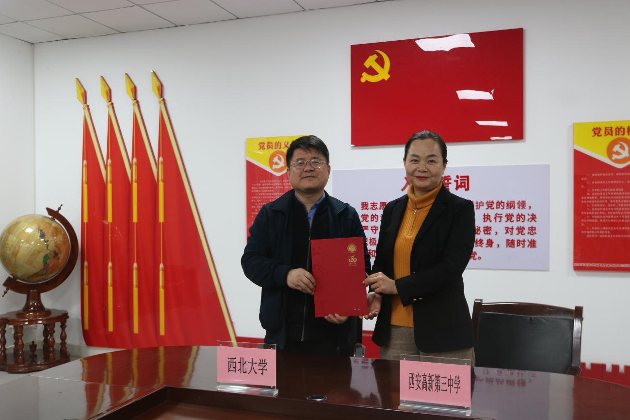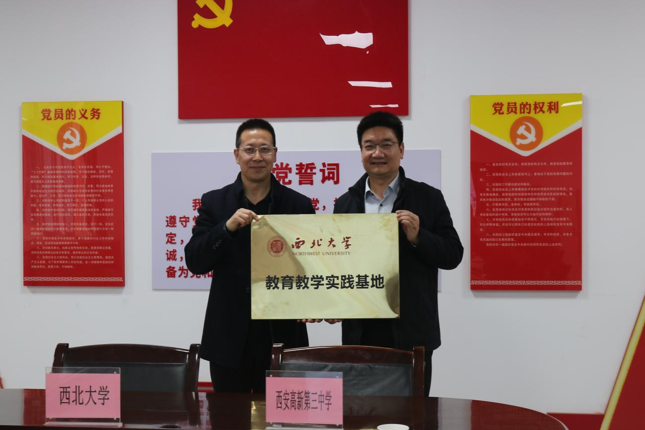 会后,yl88858cc永利官网副院长邵勇代表学校与高新第三中学签订了“西北大学教育教学实践基地合作协议”,学院党委书记曹振纲与高新第三中学党支部书记、校长姬亚鹏共同为“西北大学教育教学实践基地”揭牌。通过授牌,进一步加强了西北大学与高新第三中学之间的联系与合作,为双方在教育领域的共同发展奠定了良好基础。