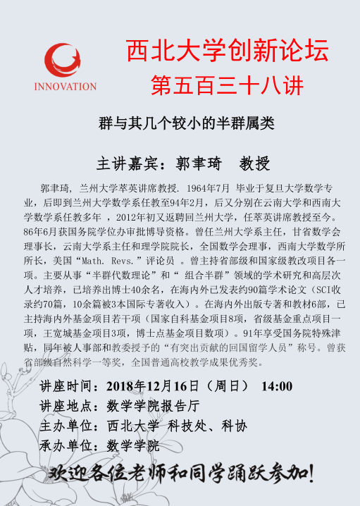 西北大学创新论坛第五百三十八讲:群与其几个较小的半群属类