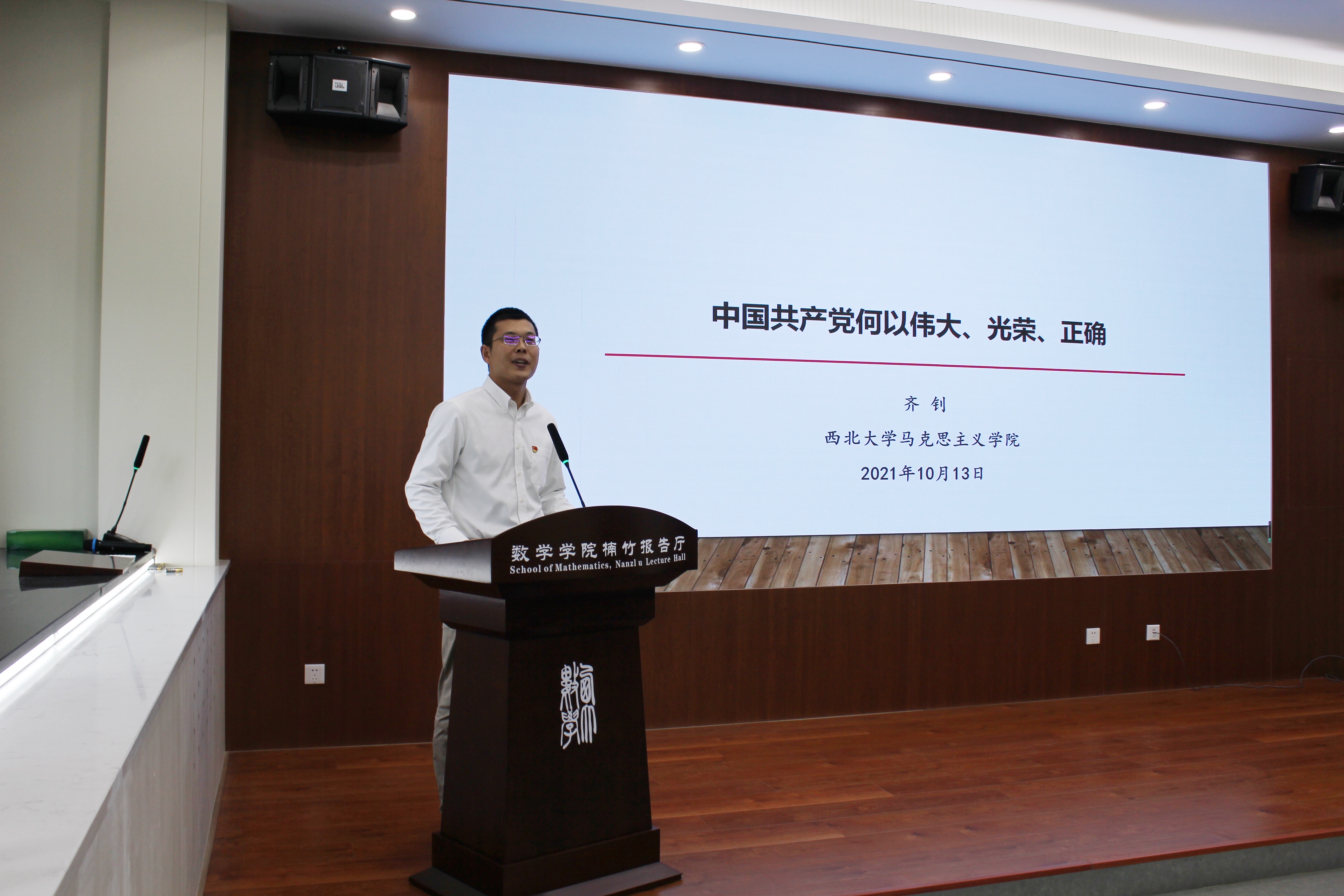 10月13日下午,yl88858cc永利官网邀请校党史学习教育宣讲团成员、马克思主义学院副教授齐钊作了“中国共产党何以伟大、光荣、正确”专题报告。学院行政支部全体党员、学生支部书记、全体团干以及100余名学生代表参加了报告会。报告会由学院学生工作负责人主持。