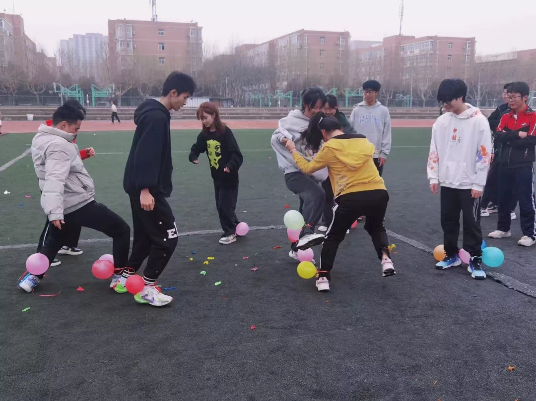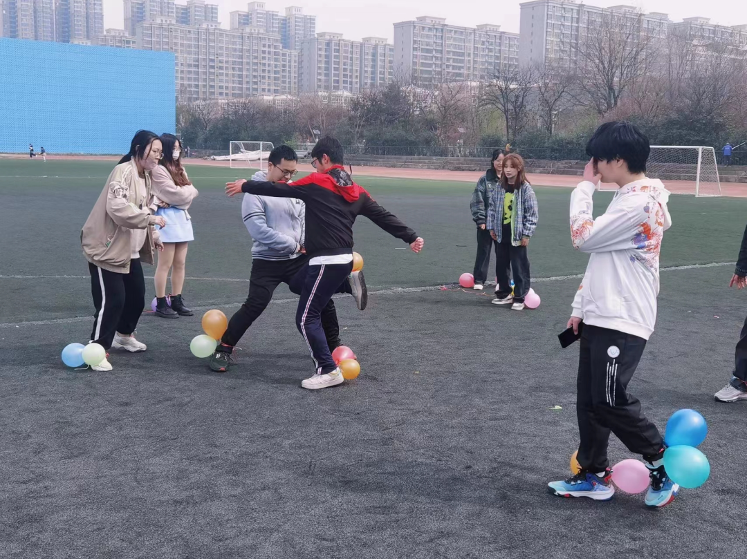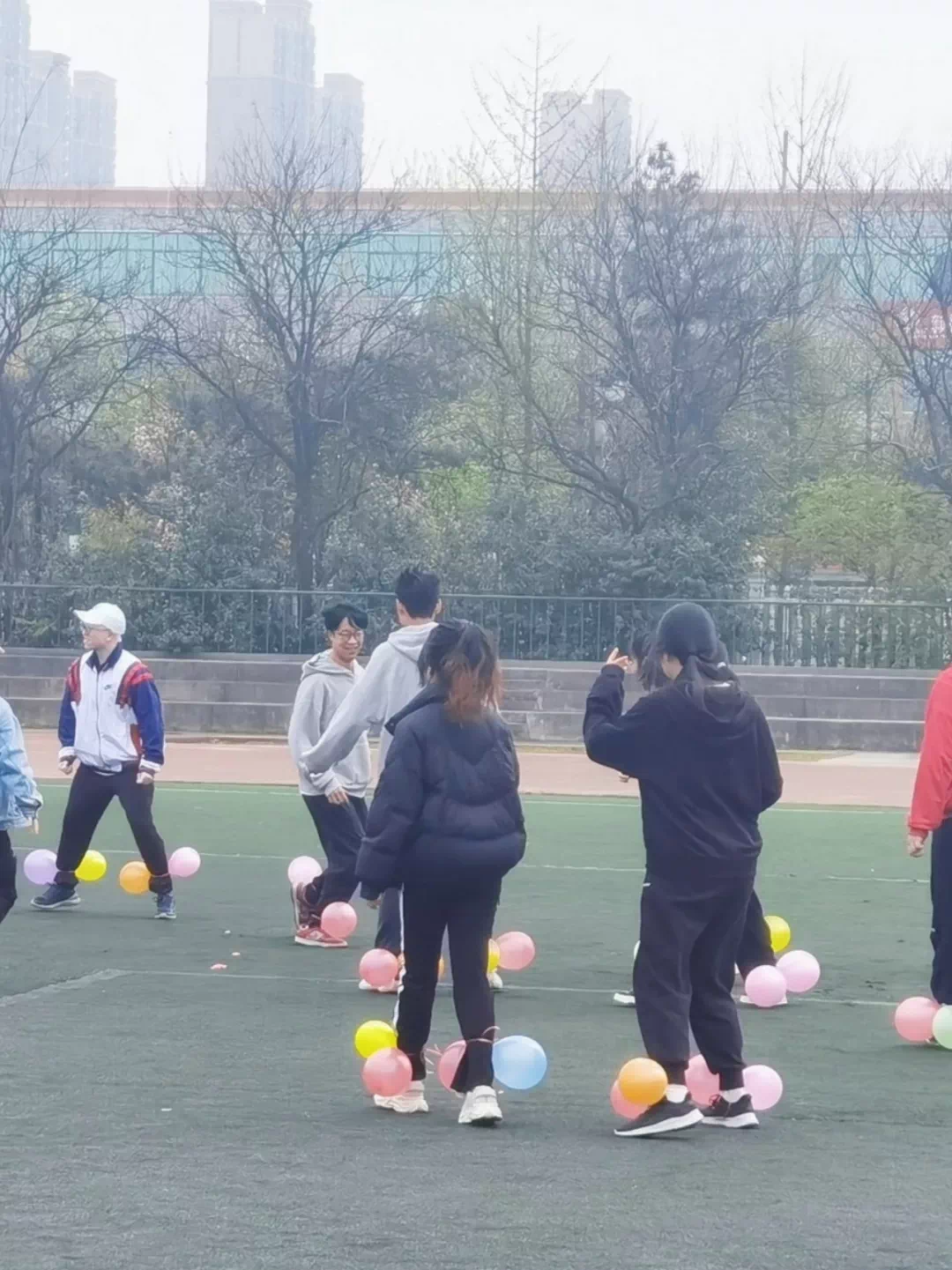游戏开始,操场上传来一阵阵气球被踩破的声音和同学们的商讨对策、互相加油打气的声音。这种声音一直回荡在空气中,久久不能散去,好生热闹!
