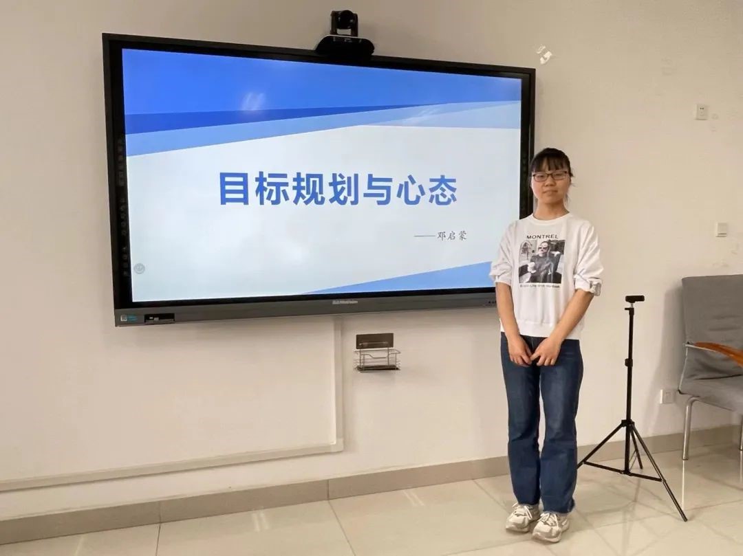 2019级金融数学专业的邓启蒙同学和大家谈及了大学时期的目标和规划。首先是确定自己未来目标是希望出国、考/保研、考公、工作等,接着介绍了大家应该根据自己的兴趣爱好确定未来的工作研究,并且要坚持下去。她为大家讲述了关于保研加分项、考研国家线等内容,向大家介绍了如何提高自己的核心竞争力:认真学习专业知识;坚持学习英语口语;积极参加竞赛。最后为大家讲述了大学生应有的心态:保持积极阳光、健康生活、早睡早起、多运动。“努力是奇迹的别名”就是她对学弟学妹们的期待。