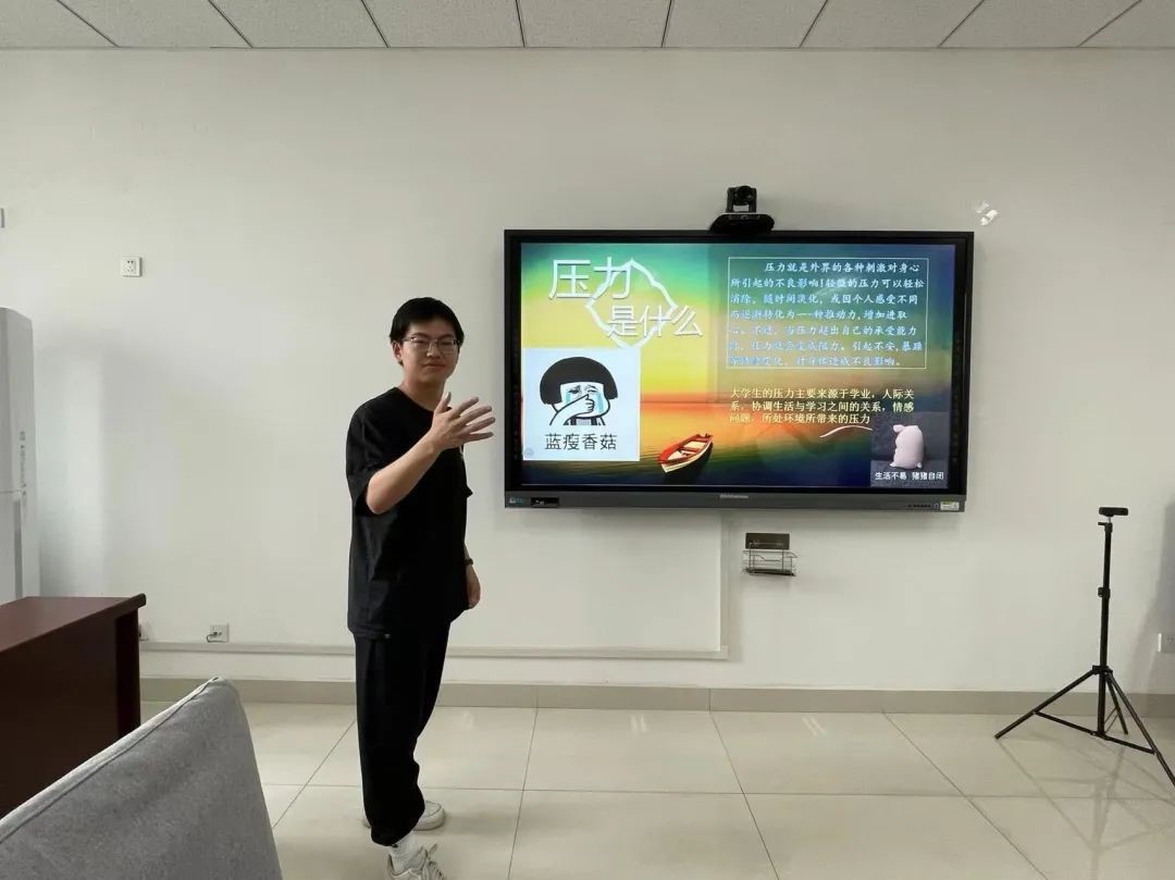 2019级数学与应用数学专业的高嵩淋同学则为大家讲述了在大学生活中压力与健康的关系。首先他介绍了大学生压力的主要来源:学业,人际关系,情感问题,环境等;其次讲到了压力所带来的生理和心理的表现以及健康的心理特征:心情经常愉快,适应能力强,善于与别人相处能较好地完成同龄人发展水平应做的活动,具有调节情绪的能力;之后讲到了压力的预防;最后给大家介绍了心理中心的预约咨询方式,并且希望大家都可以“面朝大海,春暖花开”,拥有一个积极健康的心态和丰富多彩的大学生活。