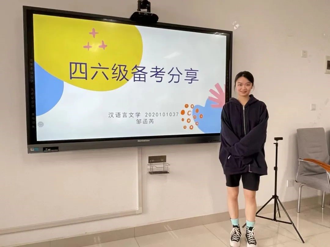 2020级汉语言文学的邹函芮同学和大家分享了自己的英语四六级备考经验。首先她讲到了作文和翻译,作文主要是背标准句式,关于翻译她为大家推荐了学习强国,利用闲暇时间看每日一词;关于听力,她强调应该睡前精听,一直听直到把所有的单词都听懂为止;阅读理解方面,她利用找关键词句的方法去做题;大意概括题,她推荐同学们看一段找一段。对于备考四六级,她希望同学们将英语学习日常化,一定要对自己的实力有自信;最后她提醒大家注意四六级考试考场的纪律问题,祝大家逢考必过!
