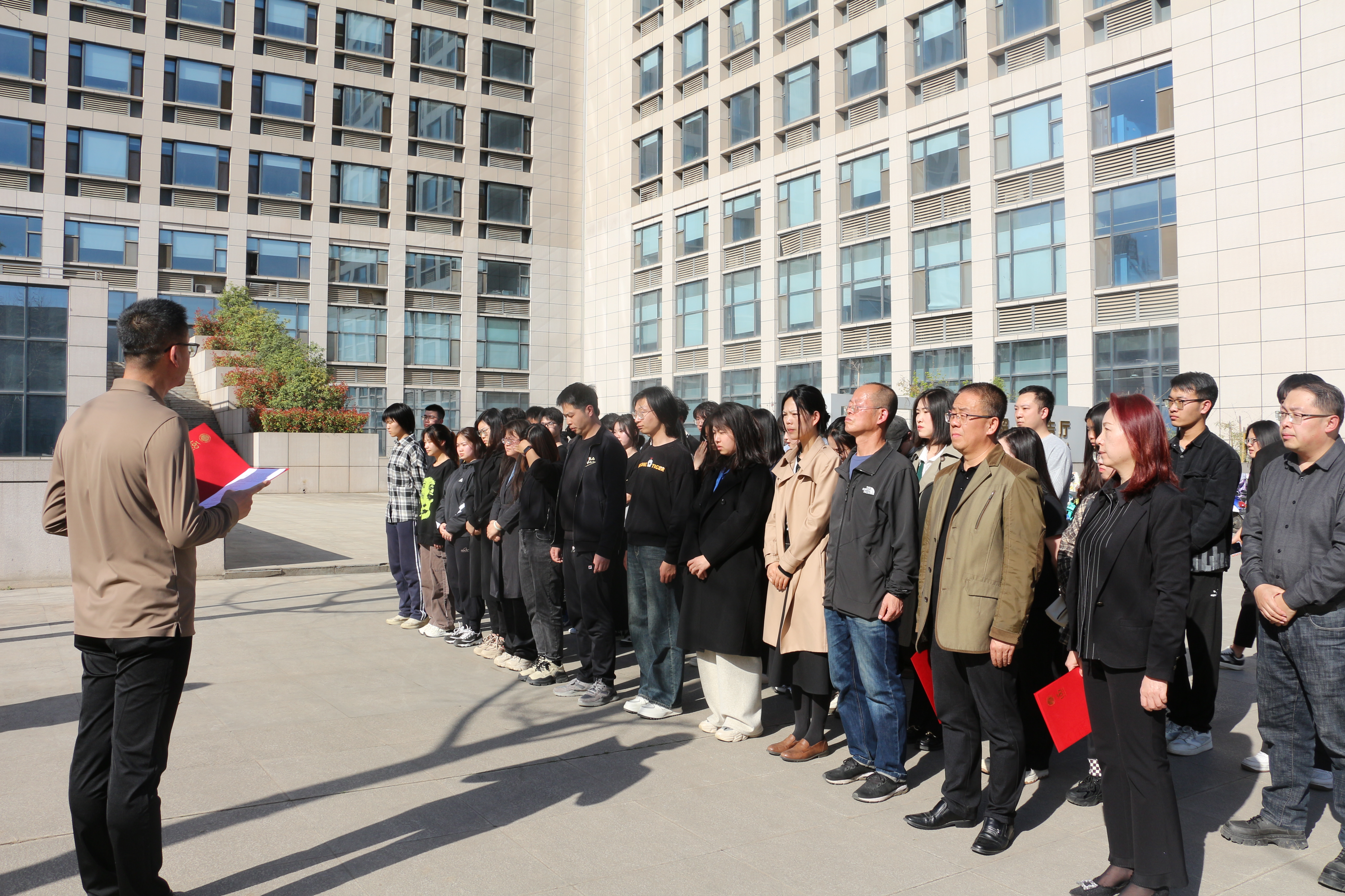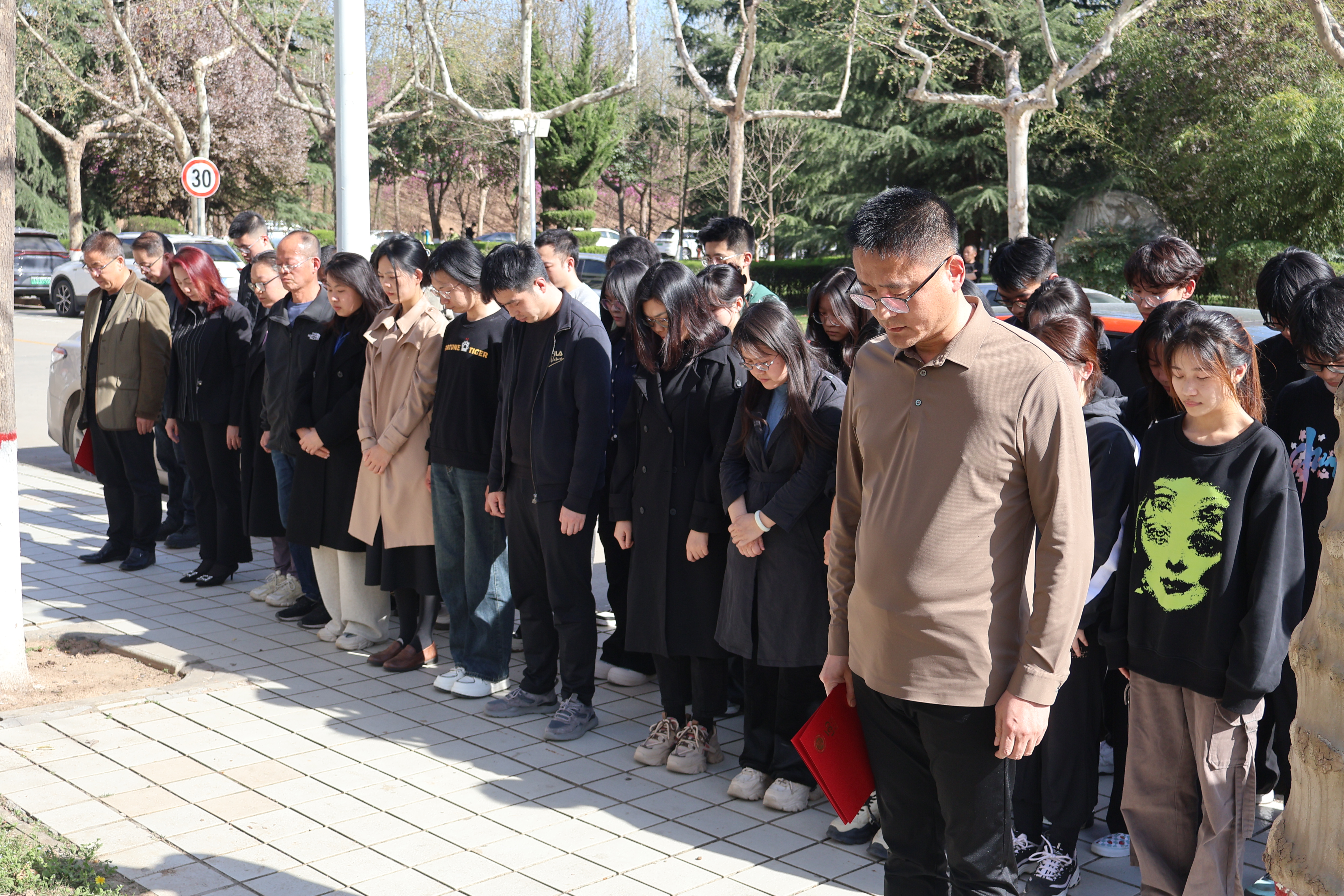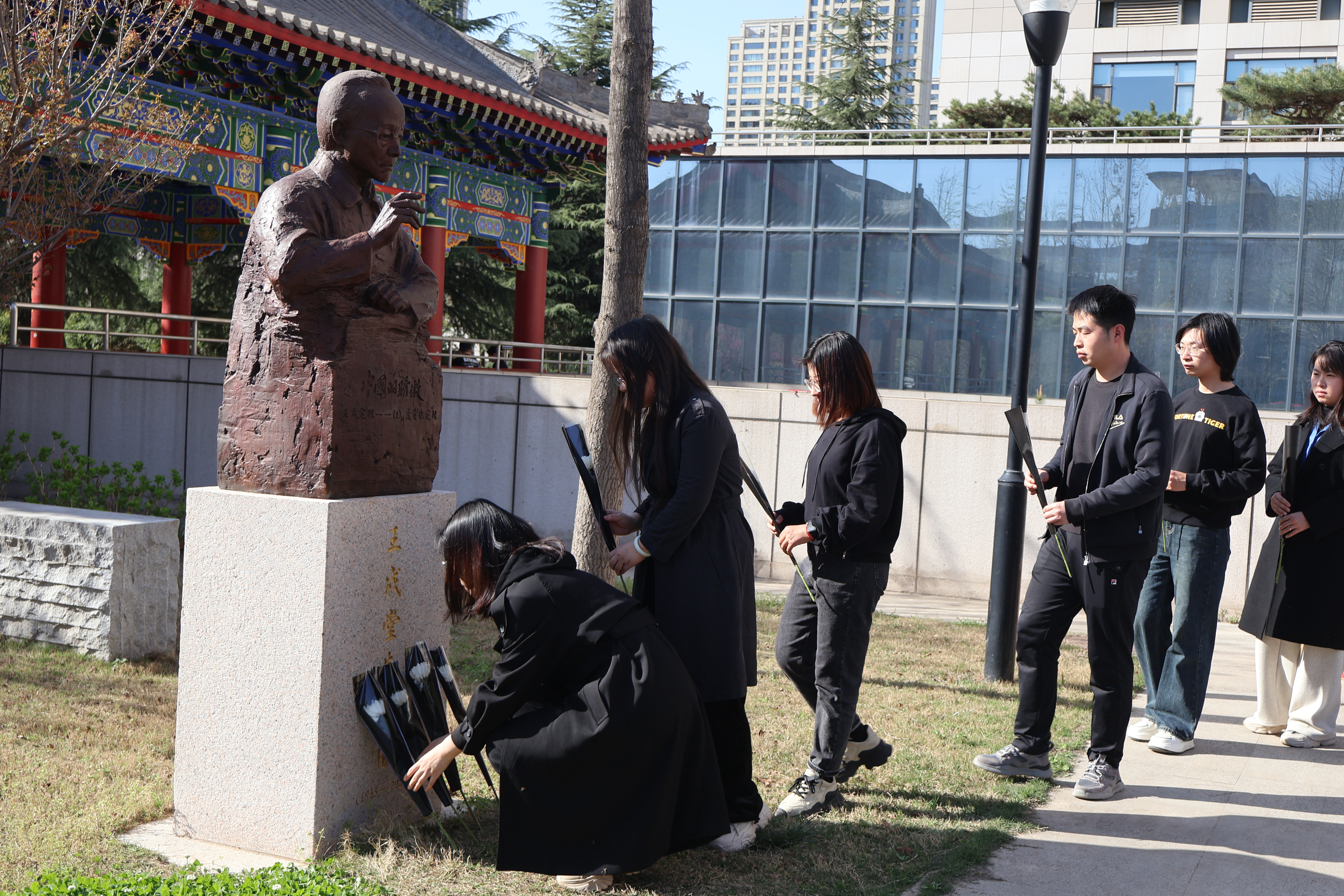 接着全体参与师生移步到王戍堂先生雕像前,共同缅怀王戍堂先生。在场师生为王戍堂先生默哀三分钟,三致深躬后依次向王戍堂先生雕像献花,以表达对先生的深切思念与敬意。