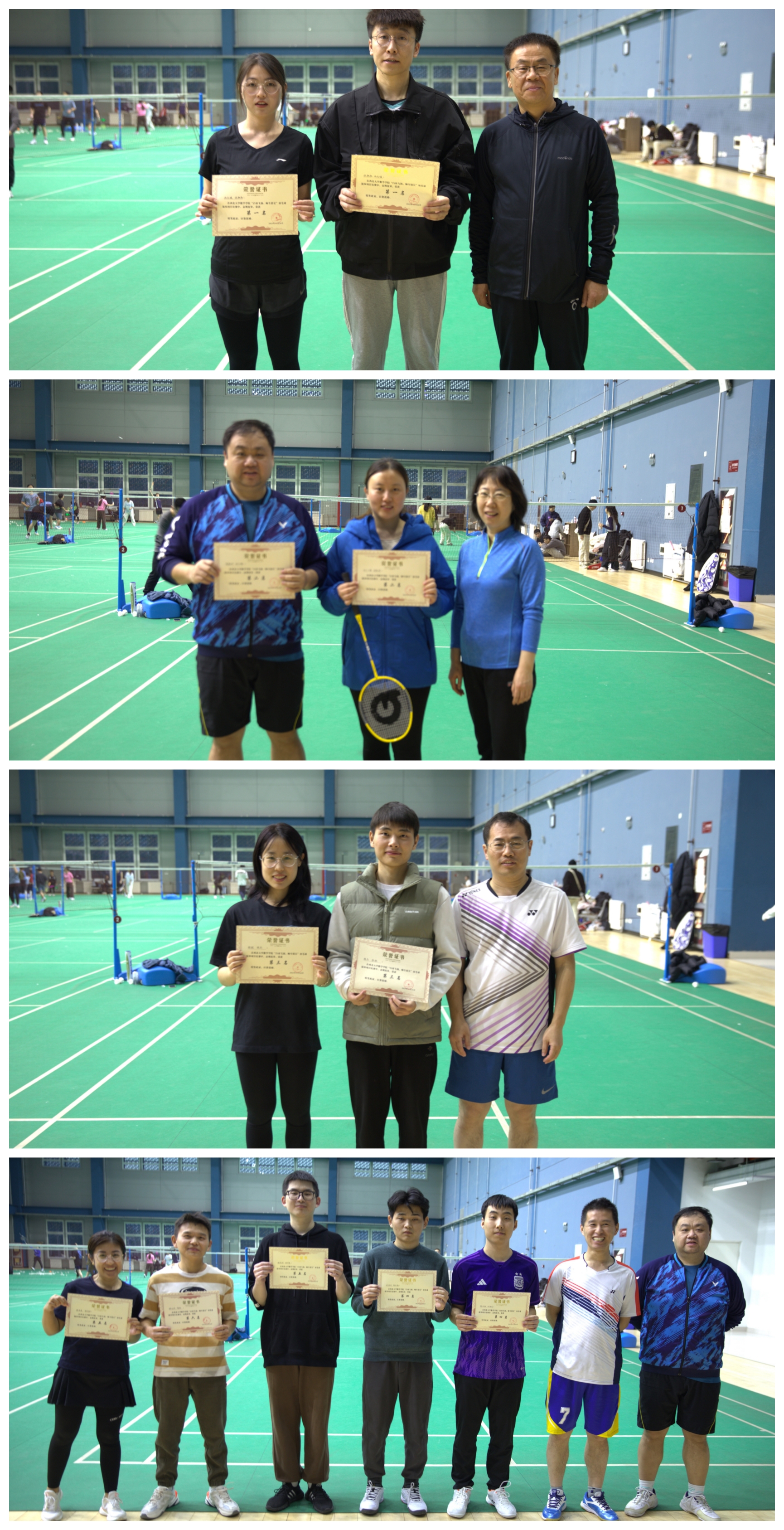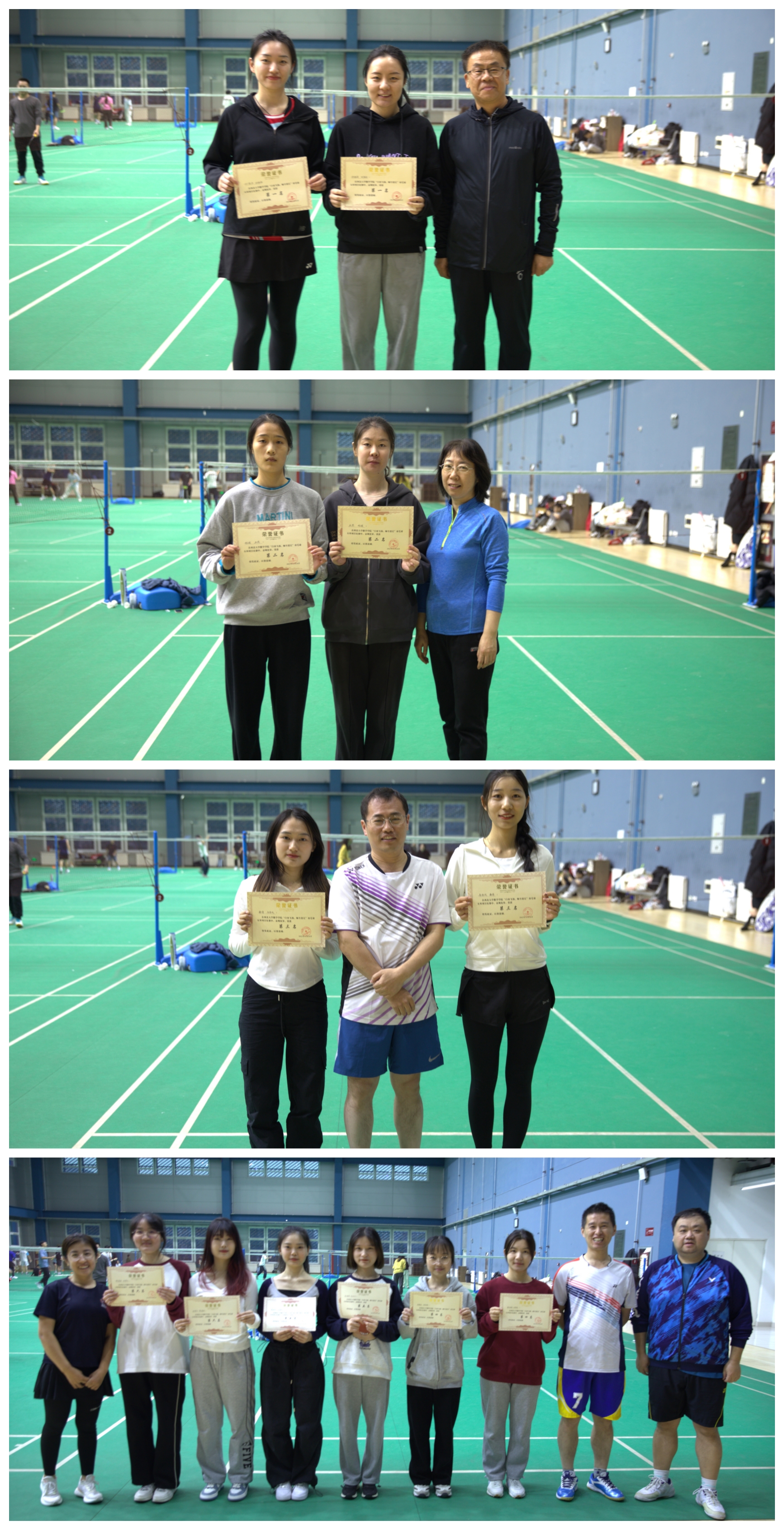 终场的哨声响起,比赛结束了。选手们互相致以赞美和鼓励,他们用自己的奋斗和汗水展现了羽毛球运动的魅力与激情。他们实力的竞争,师生情谊的链接,场上的拼搏,一切都将成为心中难以磨灭的回忆。闭幕式上,李长宏书记、魏玲老师、冷成财老师、吴振刚老师、张洁琼老师和李岩老师分别为获胜队伍颁发奖状和奖品并合影留念。